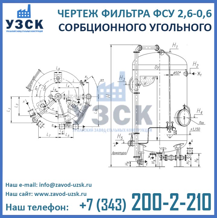 Изготовление сорбционных угольных фильтров ФСУ 2,6-0,6 в Новокузнецке осуществляется из стали. Корпус аппарата представляет собой цилиндрическую обечайку из стального листа с приваренными к ней сверху и снизу штампованными днищами эллиптической формы. Для монтажа на фундамент, фильтр оснащен тремя опорами. Для присоединения трубопроводов обвязки в центре днищ имеются фланцы. Корпус аппарата снабжен двумя люками-лазами, необходимыми для загрузки сорбента, осмотра, ремонта и обслуживания фильтра. Внутри фильтра расположены нижнее сборно-распределительное устройство (НРУ) и верхнее (ВРУ).