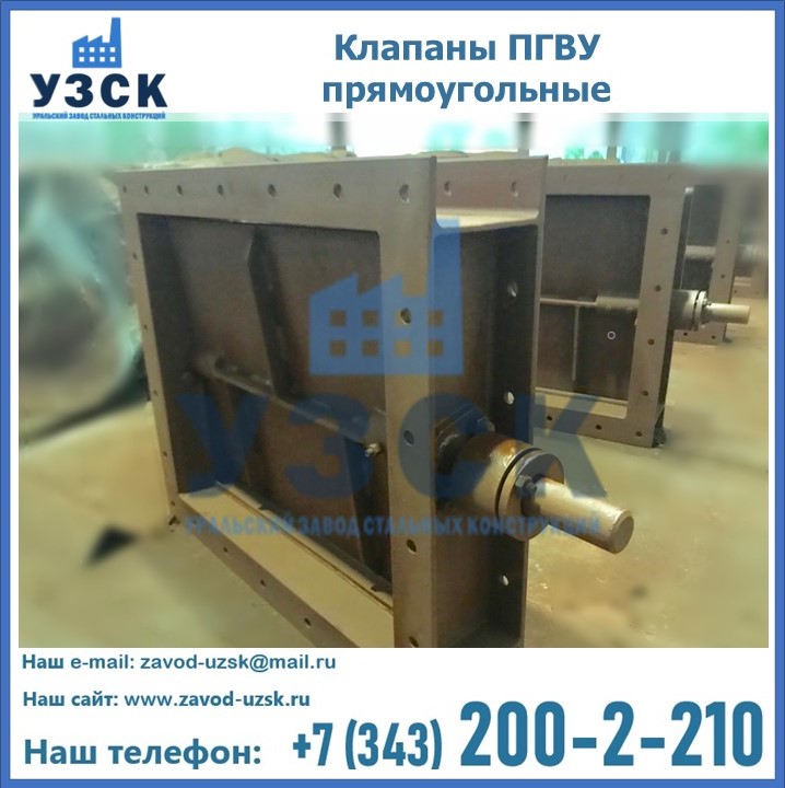 Прямоугольный клапан ПГВУ имеет прямоугольную или квадратную форму, по основному сечению конструкции, на которую устанавливается клапан. Для изготовления шиберов ПГВУ в Новокузнецке применяются сталь нержавеющая, углеродистая или низколегированная, в зависимости от модели. Внутри клапана имеется запорный элемент, передвигающийся параллельно общему потоку движения среды. Запорный элемент, или створка имеет такую же форму, как и основное сечение. Перемещение створки происходит благодаря возвратно-поступательным движениям.